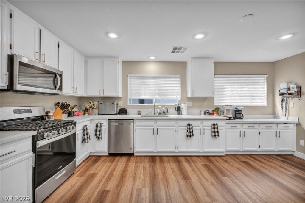 Experience modern comfort and peace of mind in this beautifully maintained 3-bedroom residence located at 595 Stonehenge Walk Avenue in the heart of Southwest Las Vegas. This home features significant mechanical upgrades including a brand-new HVAC unit and a premium air filter system designed for maximum efficiency and superior indoor air quality. The open-concept interior is move-in ready with luxury vinyl plank flooring, fresh carpet, and elegant granite countertops in the kitchen. Enjoy a private outdoor retreat in the fully finished, low-maintenance backyard, perfectly situated in a quiet neighborhood just minutes from the dining and shopping hubs of Rhodes Ranch.